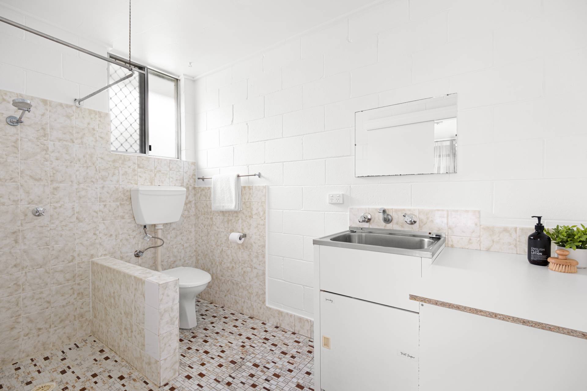 Spacious all-in-one bathroom with laundry facilities