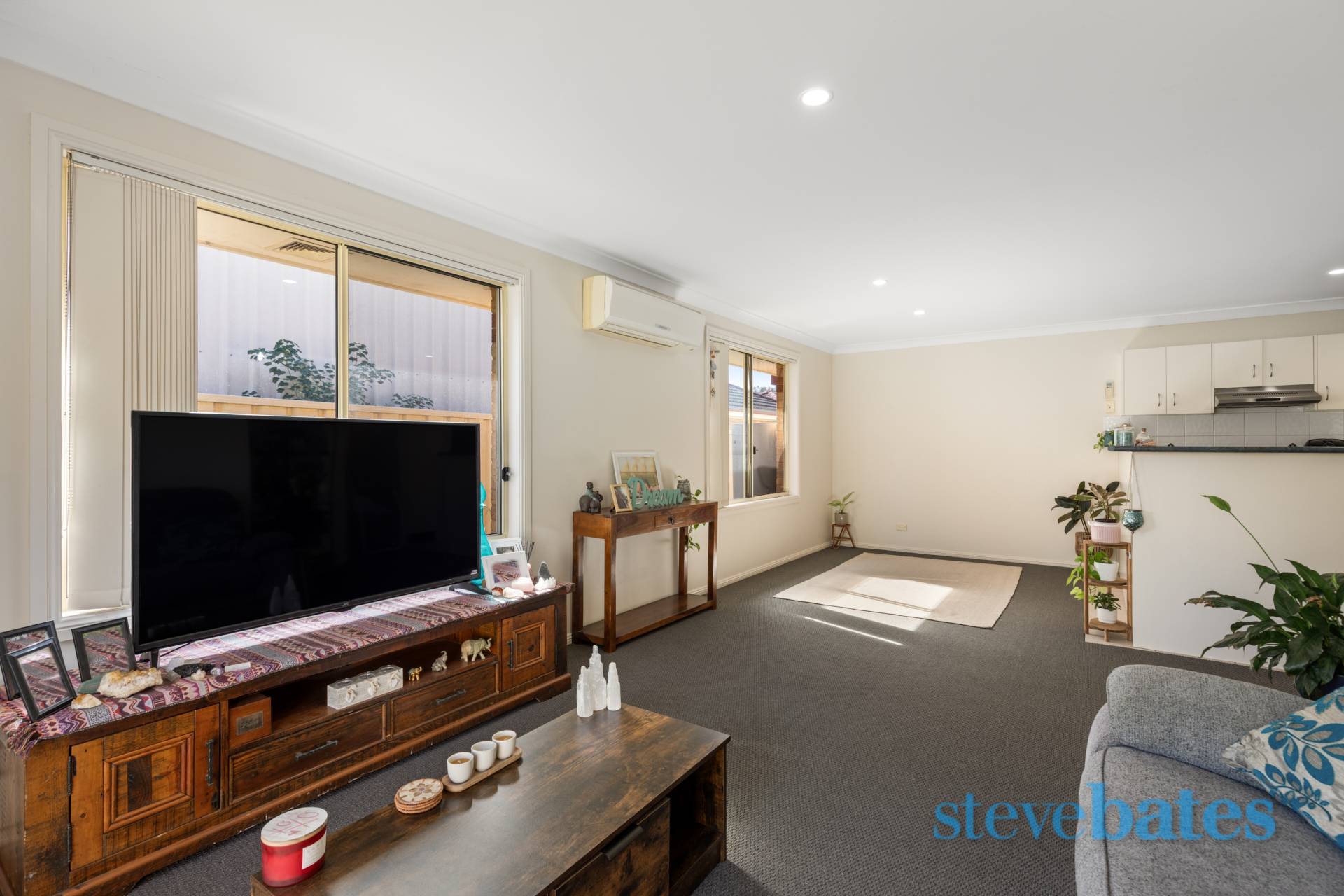 Open-plan living, dining, and kitchen with reverse cycle air conditioning