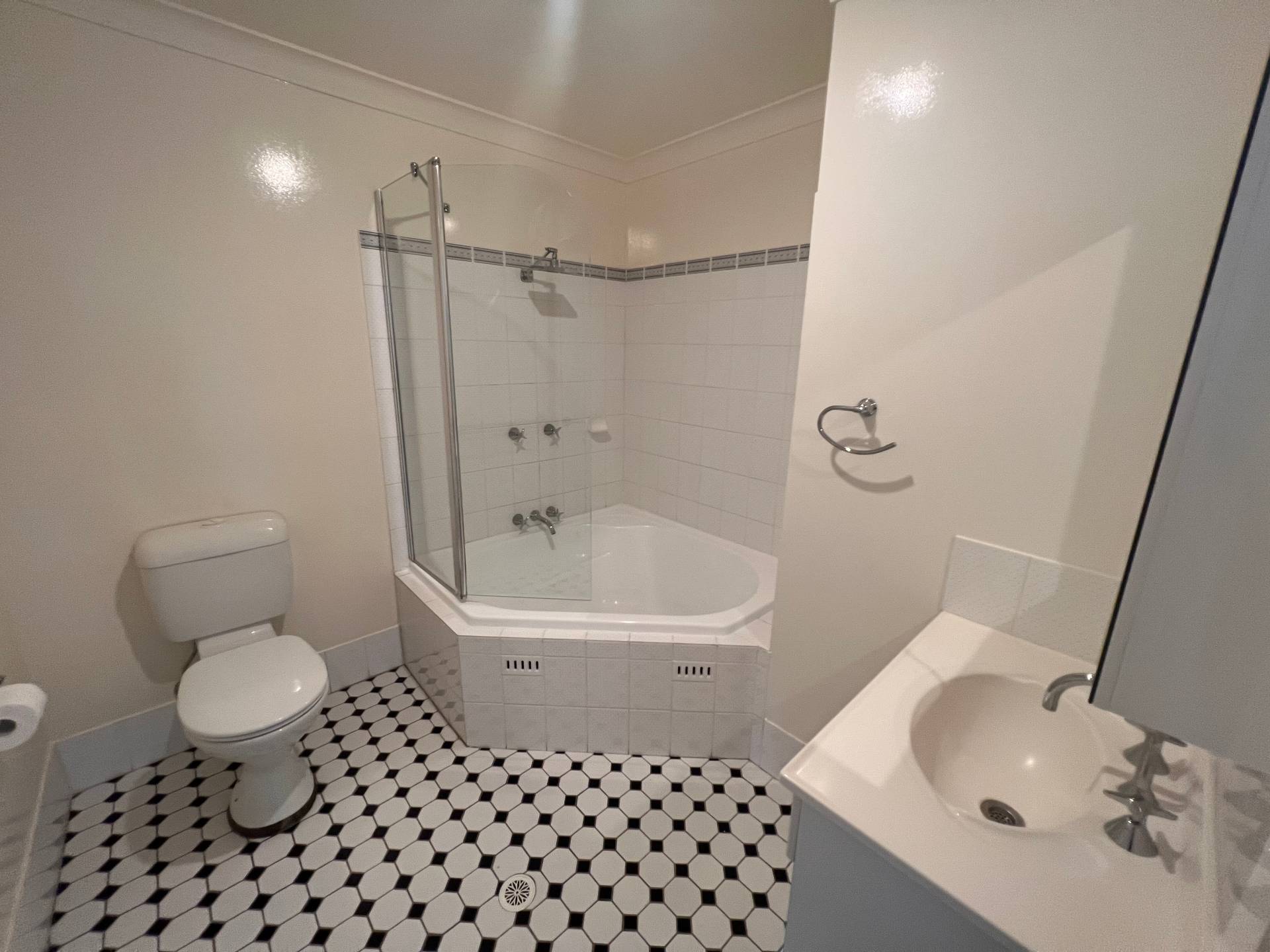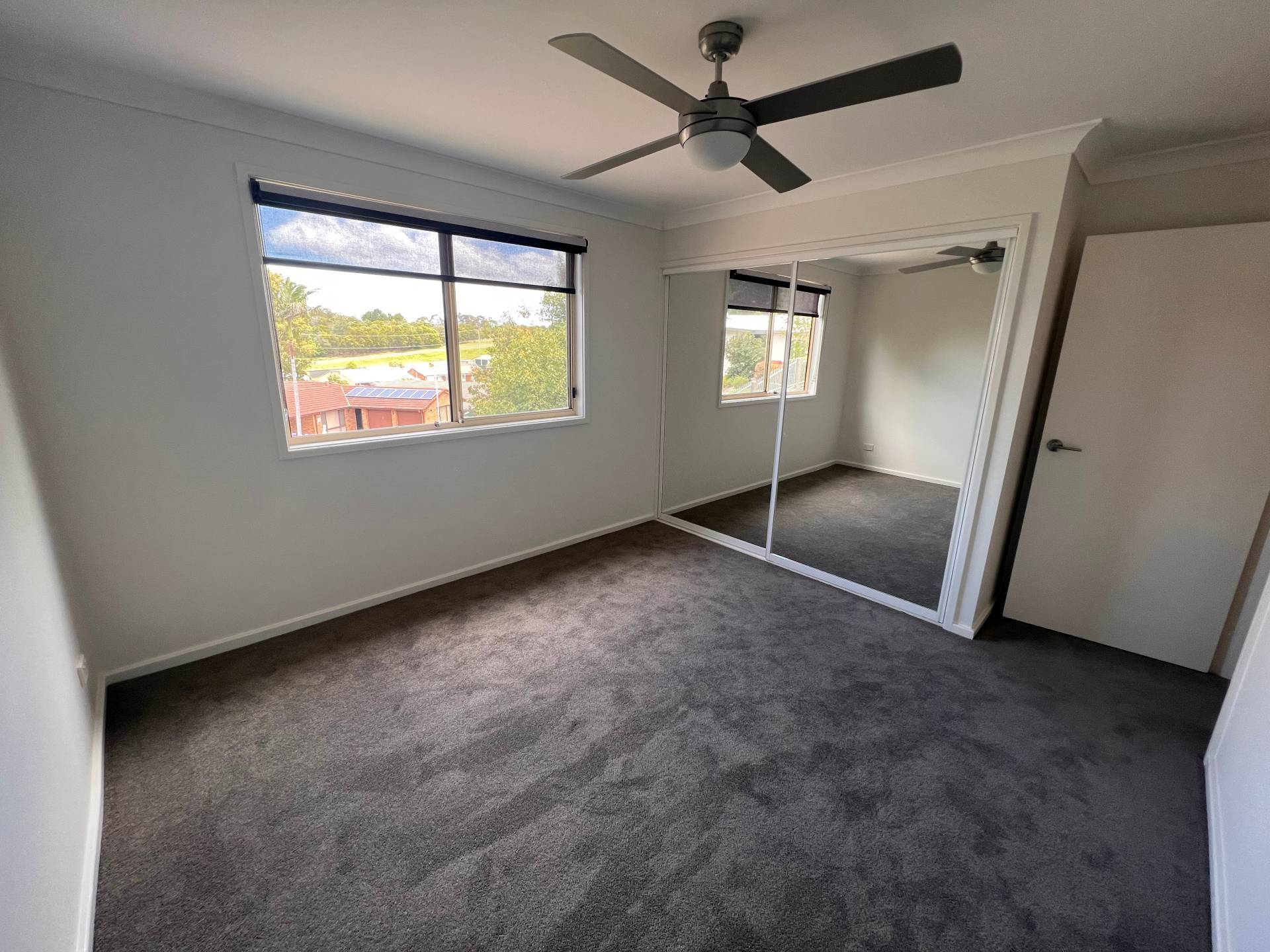 Two upstairs bedrooms feature built-in robes and ceiling fans, sharing a spacious combined bathroom with large corner bath.